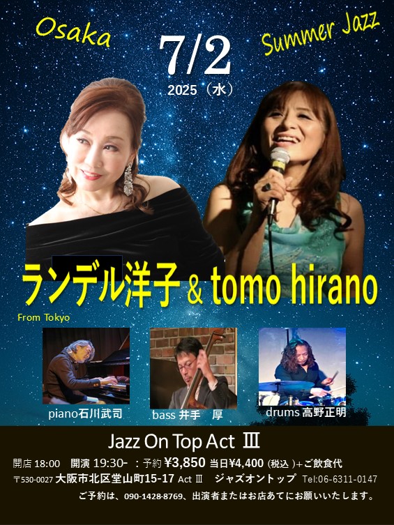 | 7 | 2 | 水 | 大阪Jazz On Top Pf石川武司 b井手厚 d高野 vo tom 大阪Jazz On Top 06-6311-0147 |