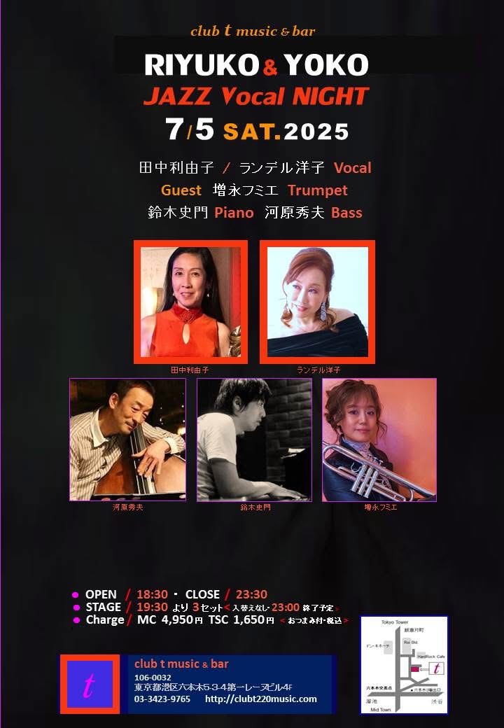 | 7 | 5 | 土 | 六本木 Club t Live & Session pf鈴木史門 b河原秀夫 vo田中利由子ほか 19:30〜3set 東京都六本木5-3-4第一レーヌビル4F 03-3423-9765 http://clubt220music.com |