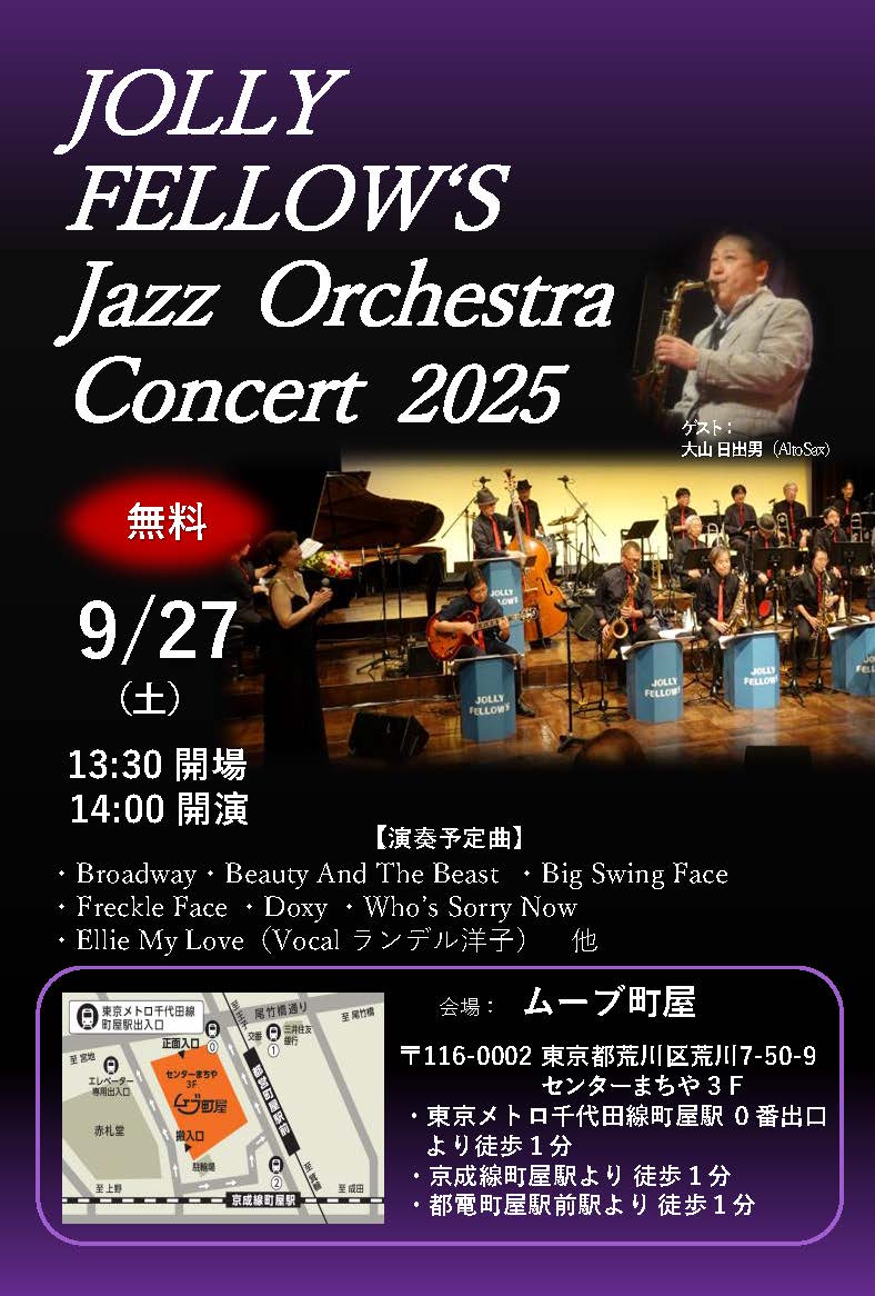 | 9 | 27 | 土 | Jolly Fellows‘ Jazz Orchestra 13:30 開場 14:00開演 無料 町屋ムーブ ムーブ町屋 03-3819-7761 |