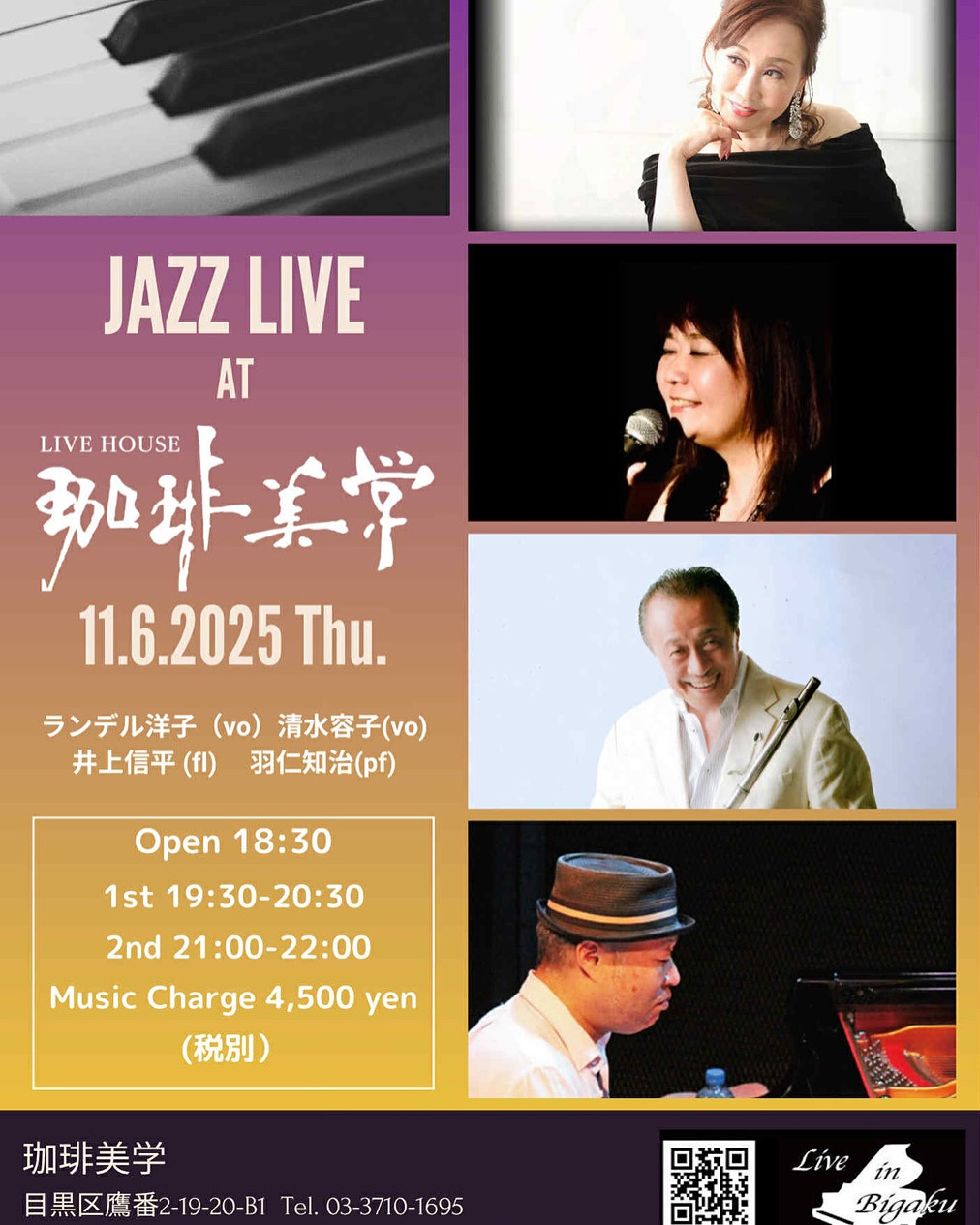 | 11 | 6 | 木 | 19:30 学芸大学 珈琲美学 pf羽仁知 fl井上信平 Vo清水容子 ¥4000+飲食代 学芸大学 珈琲美学 https://www.coffeebigaku.com/ 03-3710-1695 |