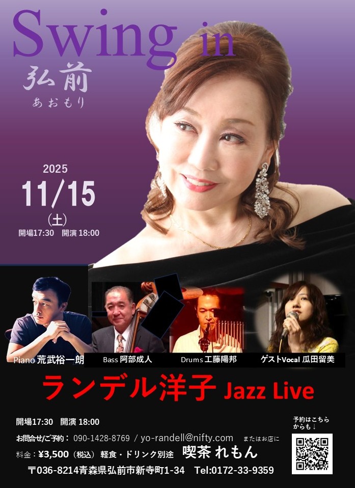 | 11 | 15 | 土 | 青森県弘前 喫茶れもん pf 荒武裕一朗 b阿部成人 d工藤陽邦 vo瓜田留美 ¥3500+飲食代 青森県弘前 喫茶れもん https://lemon.velvet.jp/wp/ 0172-33-9359 |