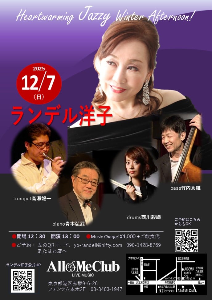 | 12 | 7 | 日 | 13:00 六本木All Of Me Club(昼) Heartwarming Winter Afternoon Jazz Live pf青木弘武 b竹雄 d西川沙織 tp高瀬龍一 六本木All Of Me https://www.allofmeclub.net/ 03-3403-1947 |